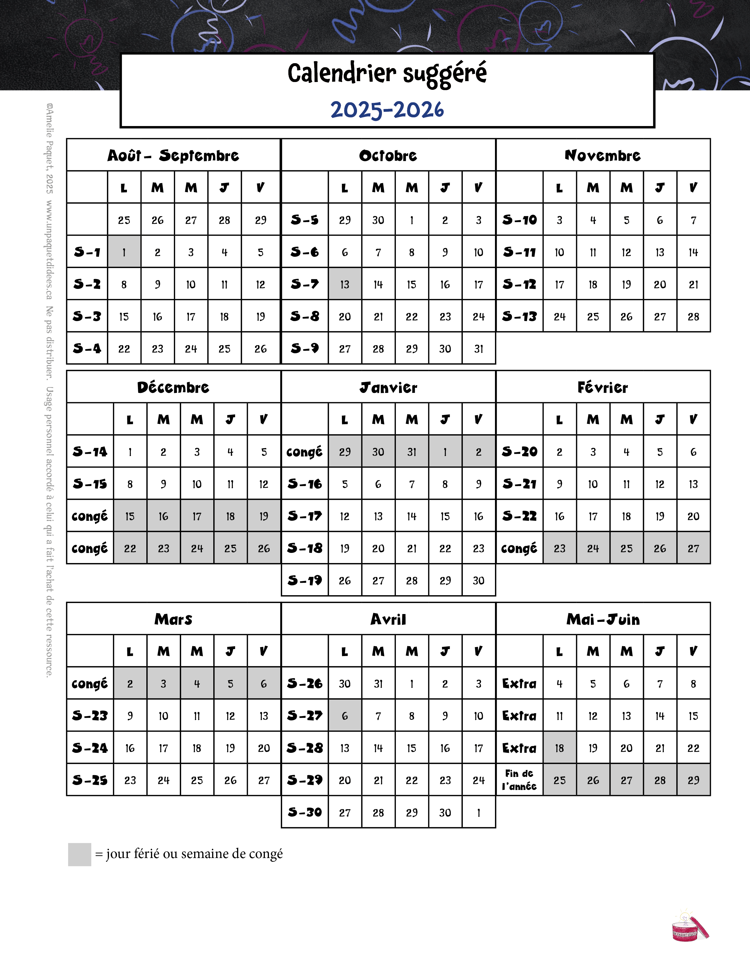 Durant les semaines de congé indiquées sur ce calendrier, il n'y a pas de ressources mises en ligne sur la plateforme.